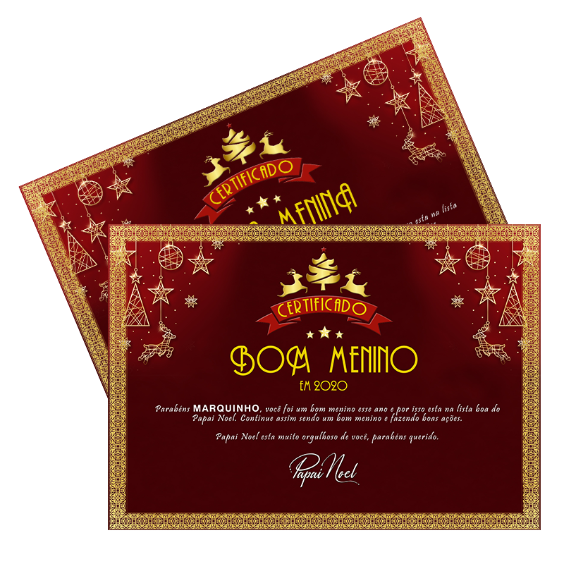 Descrição: CERTIFICADO Certificado com nome da pessoa (menino ou menina) que se comportou durante o ano inteiro. Papel: couche 180g Tamanho: 21x29,7 cm Cor: 4 cores Background: menino e menina