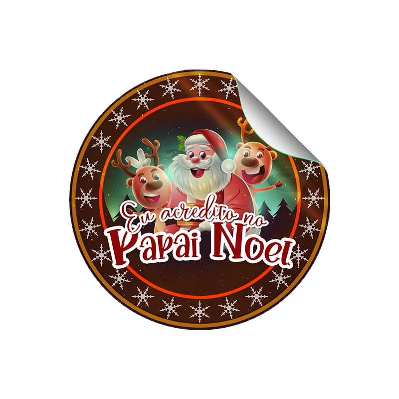 Descrição: ADESIVO Adesivo com frase: "Eu acredito no Papai Noel." Papel: adesivo 90g Tamanho: 9x9 cm Cor: 4 cores Background: temático